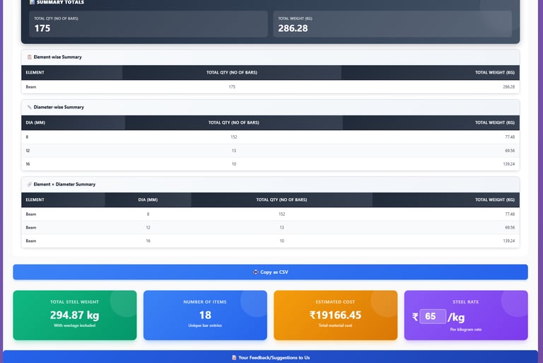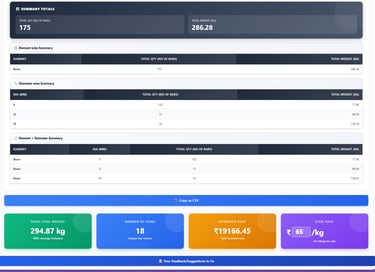 Our software calculates cutting lengths, bar quantities, weights, and reinforcement details automatically, ensuring full compliance with Indian Standard (IS) codes while saving valuable engineering time.