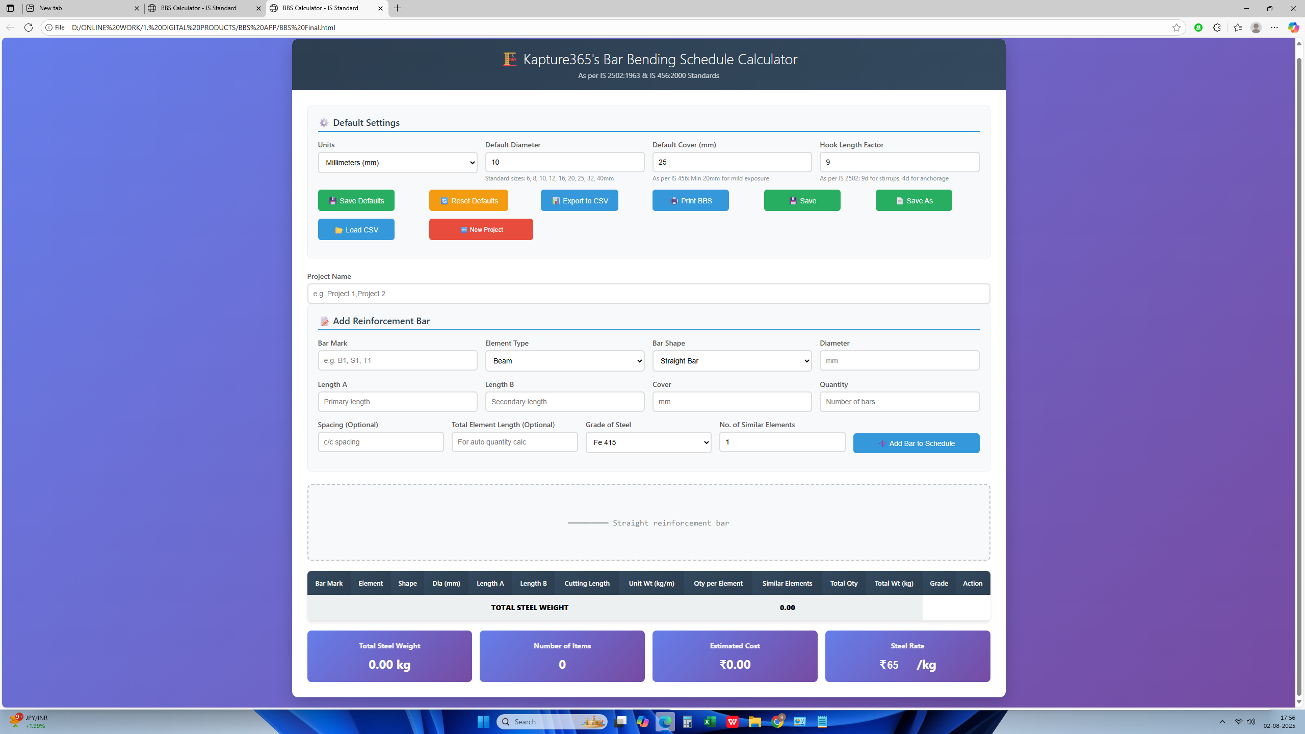The Kapture365 BBS Calculator App is designed for quick, professional-grade bar bending schedule creation with minimal input and maximum accuracy — as per IS standards.
